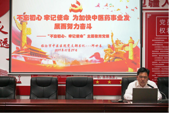 醫院院長唐貞力同志以“筑牢為人民服務的宗旨意識,推動全市中醫藥事業持續發展”為題,從學習習近平新時代中國特色社會主義思想及習近平總書記“不忘初心、牢記使命”重要論述的認識和體會,結合守初心、擔使命,加快全市中醫藥事業發展的基本思路、新時期衛生健康系統一名黨員干部悟初心、擔使命的責任和感悟為全體黨員上黨課。